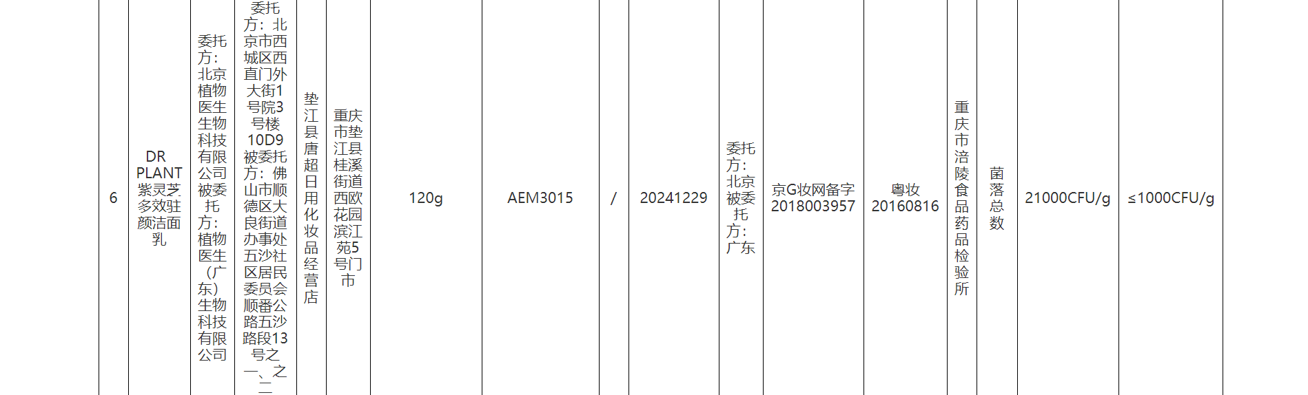 而在2022年,植物医生却因产品质量“翻了车”。据重庆市药品监督管理局发布的“关于7批次不符合规定化妆品的通告”,在2022年重庆市化妆品监督抽检工作中,经重庆市永川食品药品检验所等单位检验,共有7批次化妆品不符合规定。其中,由北京植物医生生物科技有限公司委托植物医生(广东)生物科技有限公司生产的1批次DR PLANT紫灵芝多效驻颜洁面乳被检出菌落总数项目不合格,规定要求为≤1000CFU/g,该批次产品菌落总数检验结果为21000CFU/g,超标21倍。