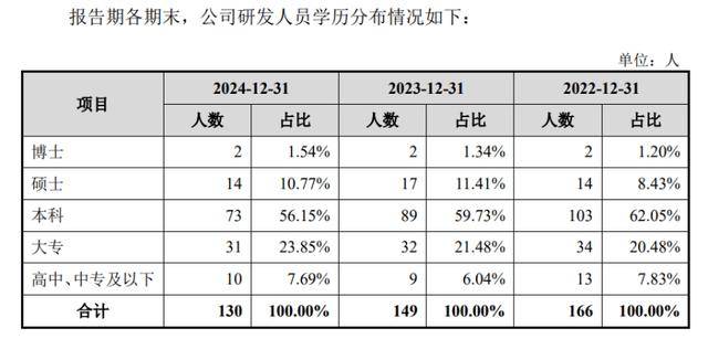 研发投入的收缩还体现在人员配置上。2022年至2024年,公司研发人员数量从166人减少到149人,再降至130人。