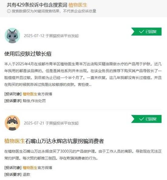 这一幕在黑猫投诉平台上并非个例。超过400条投诉,指向产品过敏、强制消费、积分清零等问题,撕开了这家号称“中国单品牌化妆品店第一名”企业的华丽外衣。