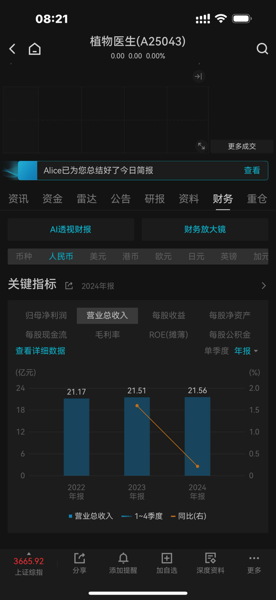 植物医生的财务报表呈现出一幅诡异的画面:2022年21.17亿元,2023年21.51亿元,2024年21.56亿元——连续三年营收几乎原地踏步。2024年相较2023年仅微增500万元,增长率不足0.3%。