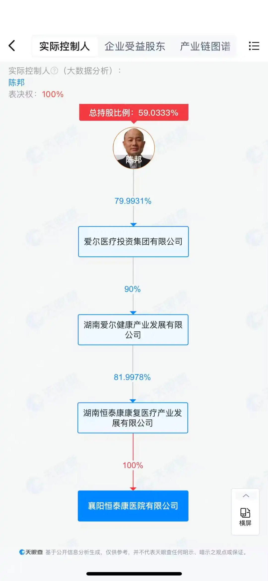 随着调查深入,涉事医院之一“襄阳恒泰康医院”的最终实控人,被指向了A股上市公司爱尔眼科董事长陈邦。