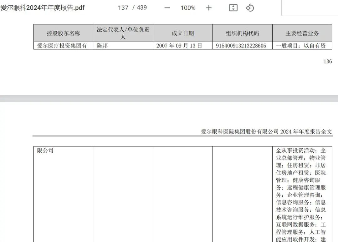 不过,据爱尔眼科2024年年报信息,爱尔医疗投资集团有限公司成立于2007年9月,陈邦为其法定代表人/单位负责人。